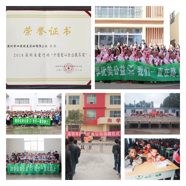 賑災捐款,參與健康類公益救助項目,捐建校舍、橋梁,改造校園設施等,檢驗著四季優美投身公益活動的成色。深圳關愛行動“十佳愛心企業”提名獎的殊榮,是對四季優美長期堅持公益的肯定。而逐年推進的“暖冬”活動及“一加一”資助行動,更已成為具有四季優美文化內涵的公益品牌。